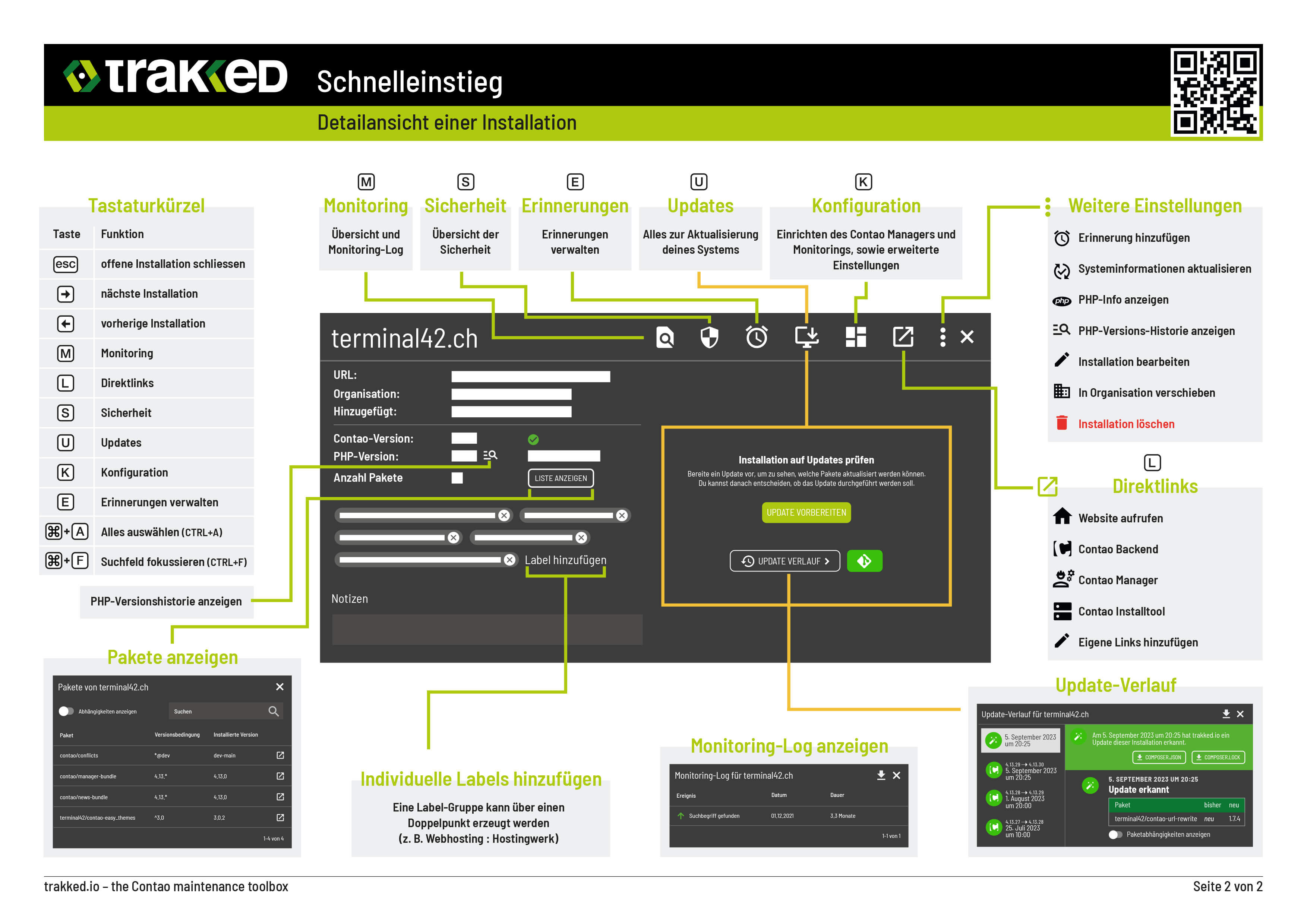 Um dir einen schnellen Überblick über den Zustand deiner Installationen zu gewähren, verwenden wir die vier Balken unseres trakked-Logos als Ampelsystem. Bei Warnungen oder Fehlern werden zudem die betroffenen Labels (Contao-Version, PHP-Version, …) entsprechend eingefärbt.