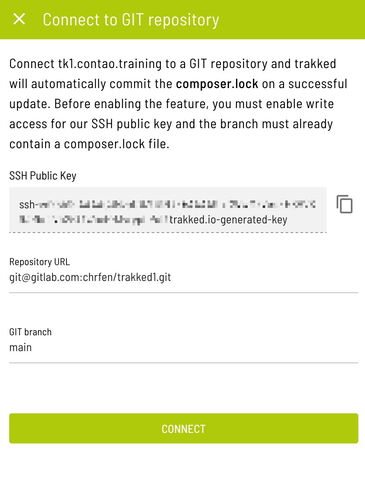 Open the desired installation in trakked and click the icon "Connect to GIT repository" in the "Updates" tab and copy the SSH public key to the clipboard.