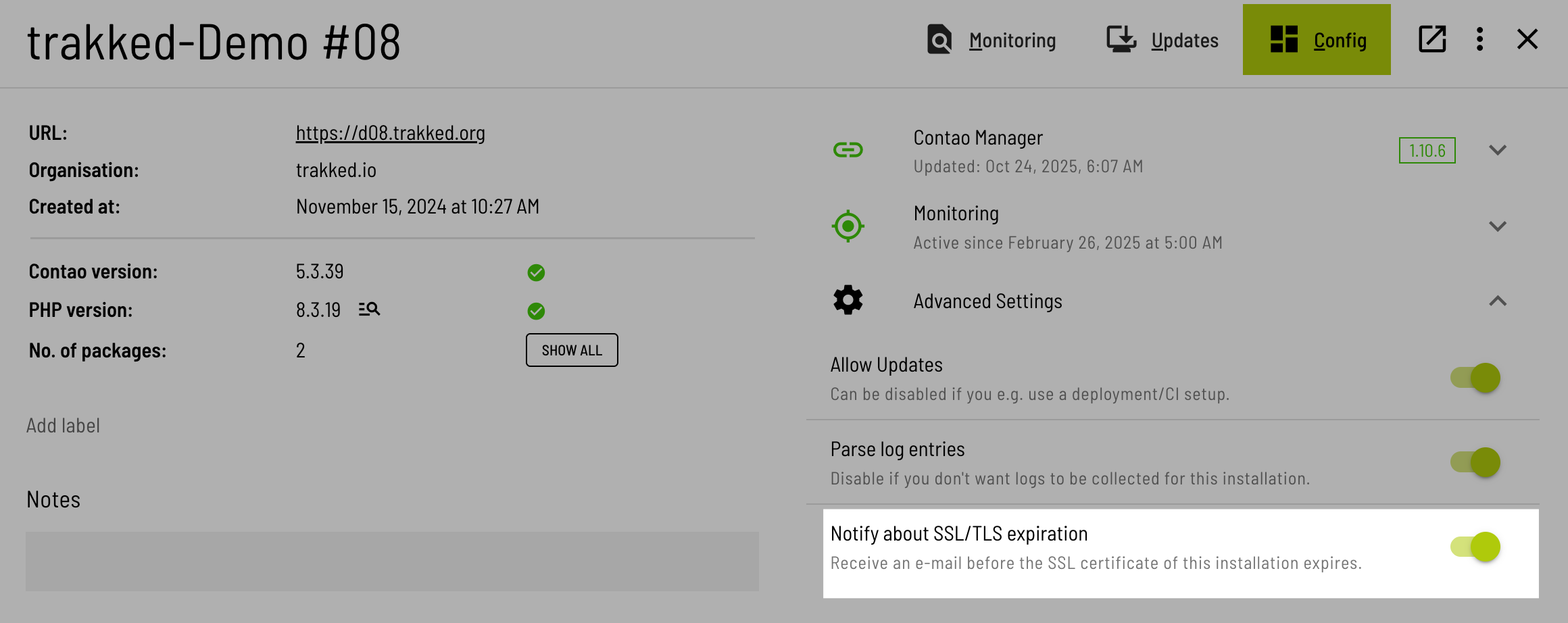In the "Configuration" tab under “Advanced settings,” you can activate the "Notify about SSL/TLS expiration" and receive an email in sufficient time before the SSL/TLS certificate expires.
